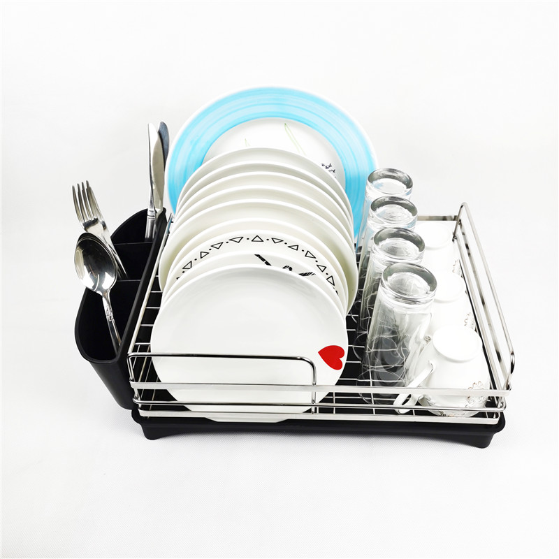 The dish drainer is 48x 29x 15.5cm, it combined with 1pc frame, 1pc removable cutlery holder and 1pc draining board, which can hold up 11 plates, , 3 coffee cups, 4 glass cup , more than 40 forks and knifes.
