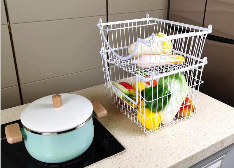 1. STACKABLE WIRE STORAGE BASKETS – Handles fold inward to stack basket on another one, making vertical storage possible and create space-saving in kitchen spaces. Front open design makes it easy to storage or take items out.