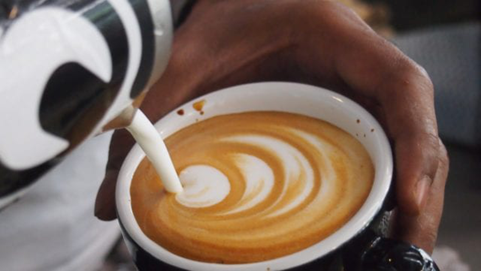 A barista pours latte art from a Teflon-coated milk pitcher.